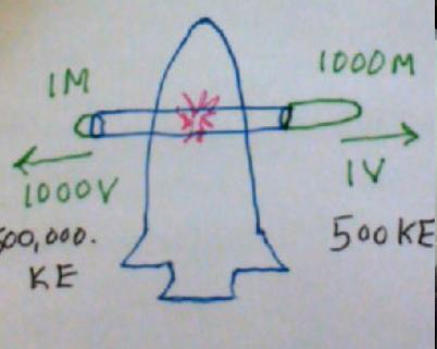 Suppose you have a rocket drifting through space with a gun barrel that goes from the left side to the right side of the ship. You place an explosive in the middle of the Gun Barrel and a 1 Mass projectile in one end of the gun Barrel, and a 1000 Mass in the other end. You trigger the explosive... 500,000. joules of KE energy flies out one side... Only 500 KE joules flies out the other side. Does the spaceship turn? If kinetic energy is real energy why can't it turn the spacecraft?